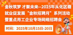 活动时间:2025年10月15日-10月20日 主办单位:广州市从化区人力资源和社会保障局 承办单位:广州永拓信息科技有限公司(旗下:从化人才网) 参会费用:免费